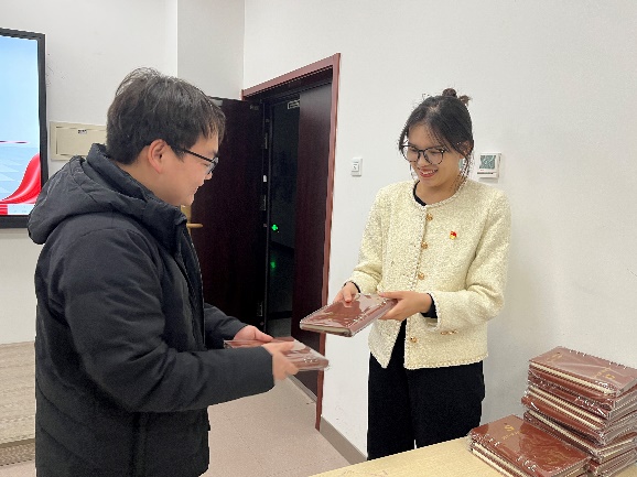 会后,色情直播 2022级博士生党支部书记李祥园向支部成员分发理论学习笔记本。