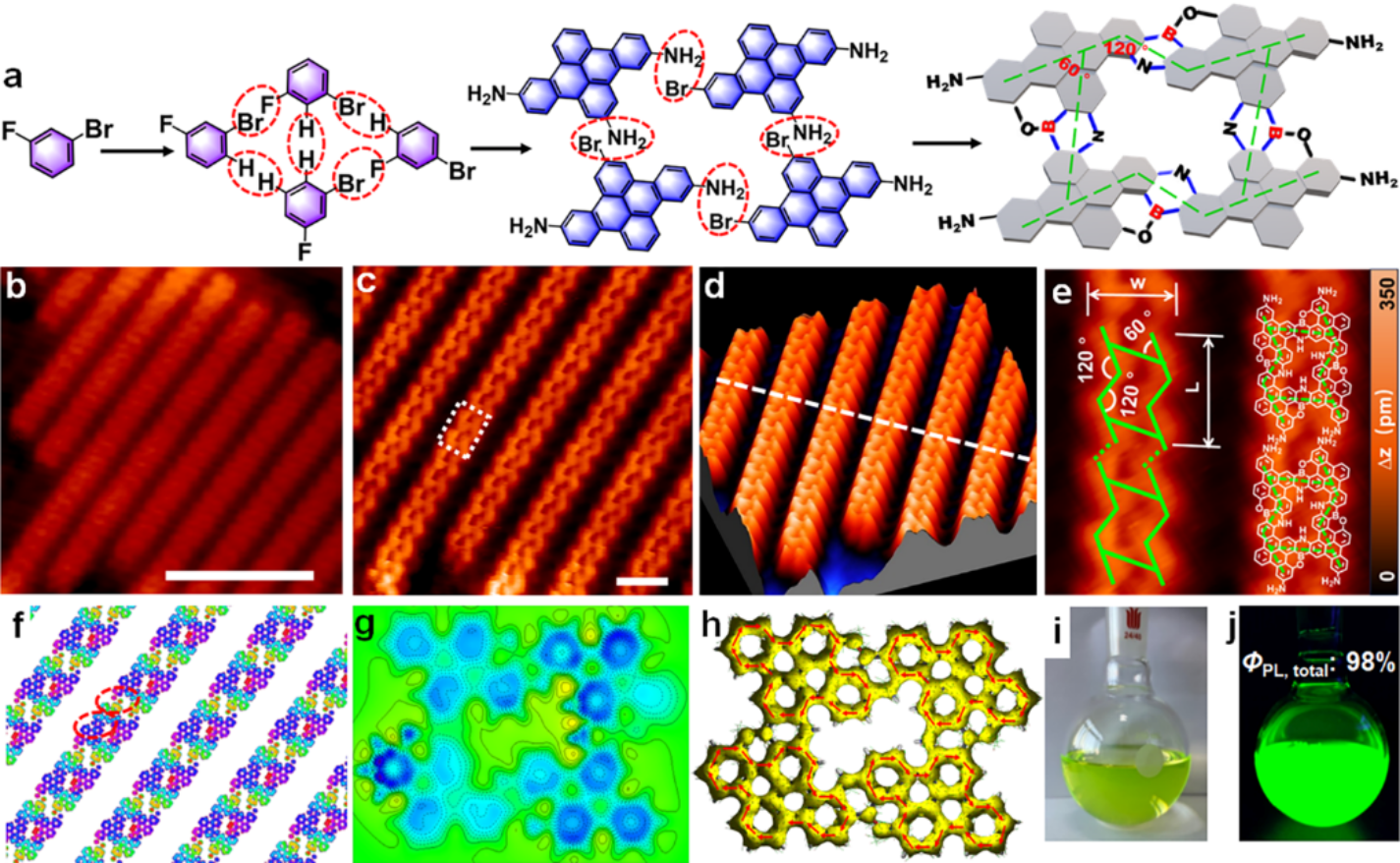 开发低成本、环境友好、可溶液加工的新型碳基量子点材料对于实现下一代大面积显示应用具有重要意义。然而,目前基于碳基发光材料的电致发光二极管外量子效率(EQE)仍然落后于发展较成熟的镉基量子点或铅基钙钛矿材料。近期,色情直播 张洋、范楼珍团队联合东南大学蒋伟团队设计合成了对称的硼桥碳量子框架(sym-B-CQFs)材料,sym-B-CQFs具有高效延迟荧光,总光致发光量子产率为98 ± 0.6%,反向系间窜越速率(kRISC)高达1.04 × 10⁶ s⁻¹。扫描隧道显微镜(STM)表征清楚地显示了sym-B-CQFs由四个二苯并[fg,op]四苯单元通过硼原子键合形成刚性非平面共轭框架结构。理论计算进一步表明,源自对称硼桥的非平面框架导致HOMO和LUMO电子云在不同的二苯并[fg,op]四苯单元上交替分布,有效减小了单重态-三重态能级差,并产生较高的kRISC。