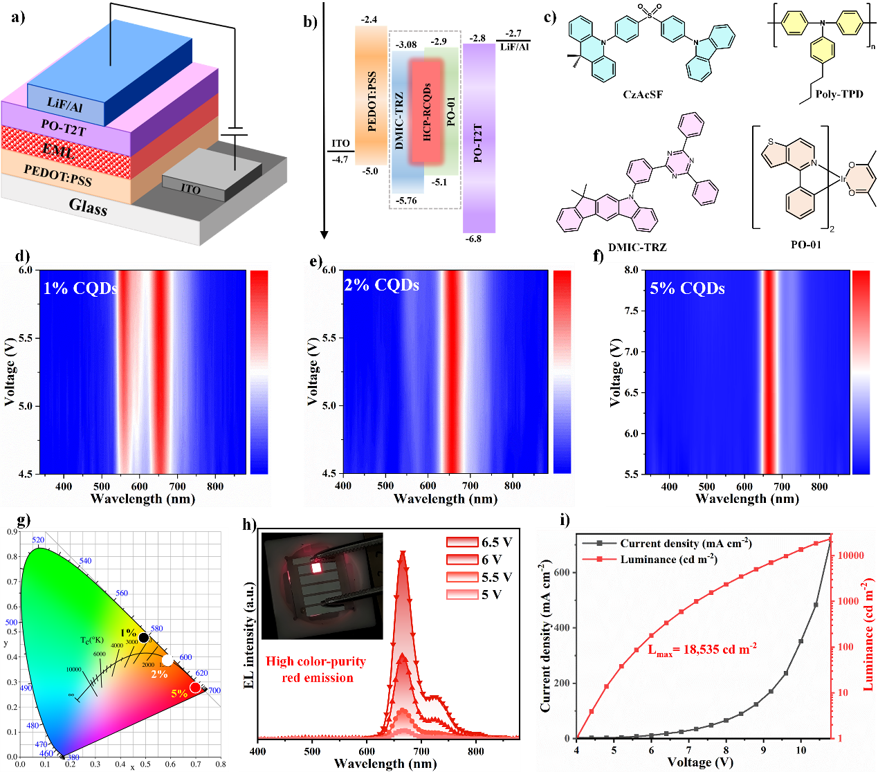 显示产业是全球科技创新与产业升级的战略要地,其中高清化已成为产业竞争的核心方向。它不仅显著提升视觉体验,也为智能终端与超高清视频产业提供了关键支撑。随着4K、8K等超高清显示技术的持续发展,高清化程度已成为衡量显示产业竞争力的重要指标。在这一进程中,具有高量子产率和窄带宽发射的发光材料,是实现高分辨率、高色彩纯度及高能效显示的关键,能够带来更清晰、真实的图像效果。碳量子点作为一种环境友好的新型发光材料,近年来在LED领域展现出良好应用前景。然而,传统碳量子点由于激子-振动耦合较强、普遍存在发射光谱宽、色纯度低等问题。尽管已有研究尝试通过表面钝化、元素掺杂等策略改善其光学性能,但在红光区域同时实现高光致发光量子产率与窄带宽发射仍面临挑战,这严重制约了基于碳量子点的广色域电致发光LED的发展。