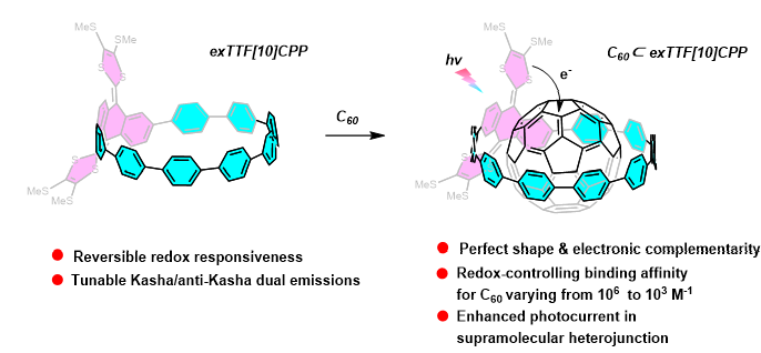 四硫富瓦烯(TTF)具有14π的平面系统,但由于缺乏环状共轭,所以不具有芳香性。在TTF的两个1,3-二硫基单元之间插入多环芳烃,可以得到π-扩展四硫富瓦烯(exTTF),其具有可逆的氧化还原性质,在氧化过程中可通过一步氧化直接生成二价阳离子。与平面母体TTF不同,exTTF的氧化过程伴随着芳香性和平面性的增加,具体表现为从蝴蝶形状的中性结构变为平面的双阳离子结构。由于其强大的供体特性伴随着氧化过程中阳离子形成时的几何构象变化,exTTF在共价和超分子集成、分子电化学、以及光伏器件等领域被广泛研究。exTTF具有扩展的π-电子共轭体系,可以作为强的π电子供体;同时由于exTTF相对较大的凹芳香表面能与富勒烯的凸面相匹配,以建立良好的范德华和π-π相互作用,因此其在主客体络合方面也具有广泛的应用。