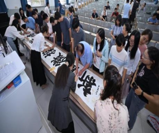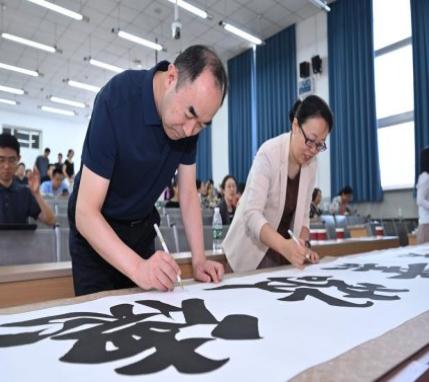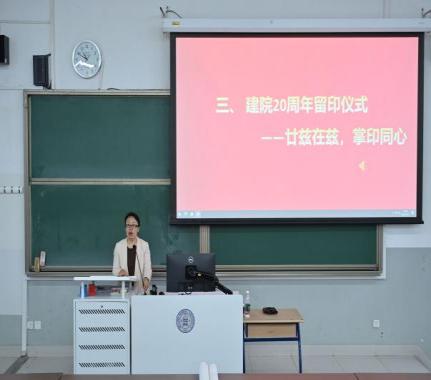 接下来是“念兹在兹,掌印同心”建院20周年留印仪式。在留印仪式中,近百名教职工在院训书法横幅上签字、留下珍贵的手印。为了帮助教职工更好地理解和领会院训的深层含义,党委书记杨钊带领大家重温了2012年学院刘知新先生拟定此院训的深意,深入解读了院训每个词背后的寓意。通过杨钊的讲解,教职工们不仅对院训有了更全面的认识,也更加明确了在日常工作中如何践行院训精神,从而为学院的进一步发展注入更多动力与凝聚力。