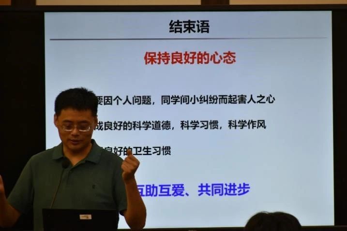 讲座的最后,赵常贵老师寄语新生,希望大家可以保持良好心态,养成优秀的科学道德、科学习惯、科学作风,与其他同学一起互助互爱、共同进步。